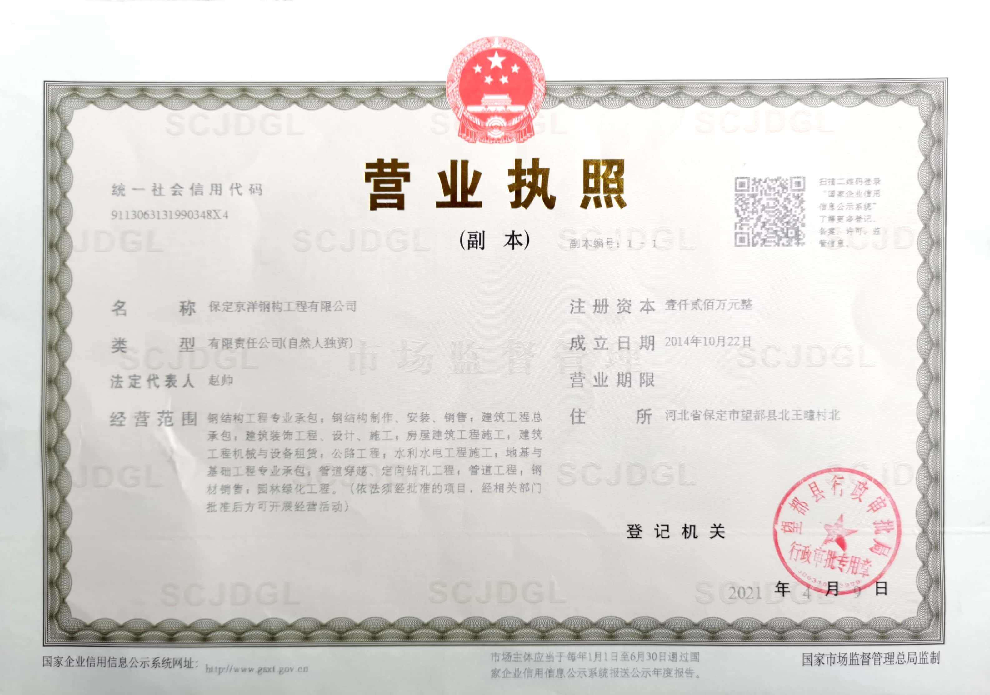 保定京洋鋼構工程有限公司位于千年古縣望都。望都縣處于京津冀核心區,是對接京津的交通要塞。距北京180公里,天津170公里,石家莊機場70公里。京石高鐵、京廣鐵路、京港澳高速、107國道四條交通大動脈縱貫全縣。圍繞望都南北各一座高鐵站,定州站(30公里)和保定站(35公里)。京昆高速、保阜高速均有連接線,四條省級公路縱橫交錯,交通便捷。